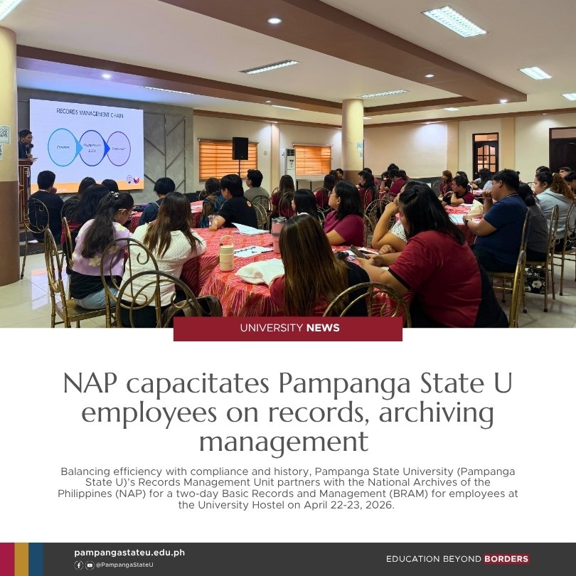 Balancing efficiency with compliance and history, Pampanga State University (Pampanga State U)’s Records Management Unit partners with the National Archives of the Philippines (NAP) for a two-day Basic Records and Management (BRAM) for employees at the University Hostel on April 22-23, 2026.
