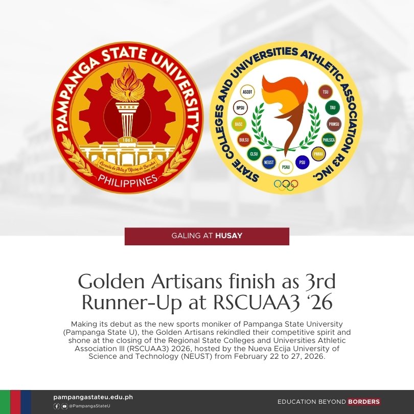 Exuding sportsmanship and school spirit, the Golden Artisans of Pampanga State University (Pampanga State U) marched as the Regional State Colleges and Universities Athletic Association (RSCUAA) III Olympics 2026 officially kicked off at the Nueva Ecija University of Science and Technology (NEUST) Sumacab Campus in Cabanatuan City on February 22, 2026.