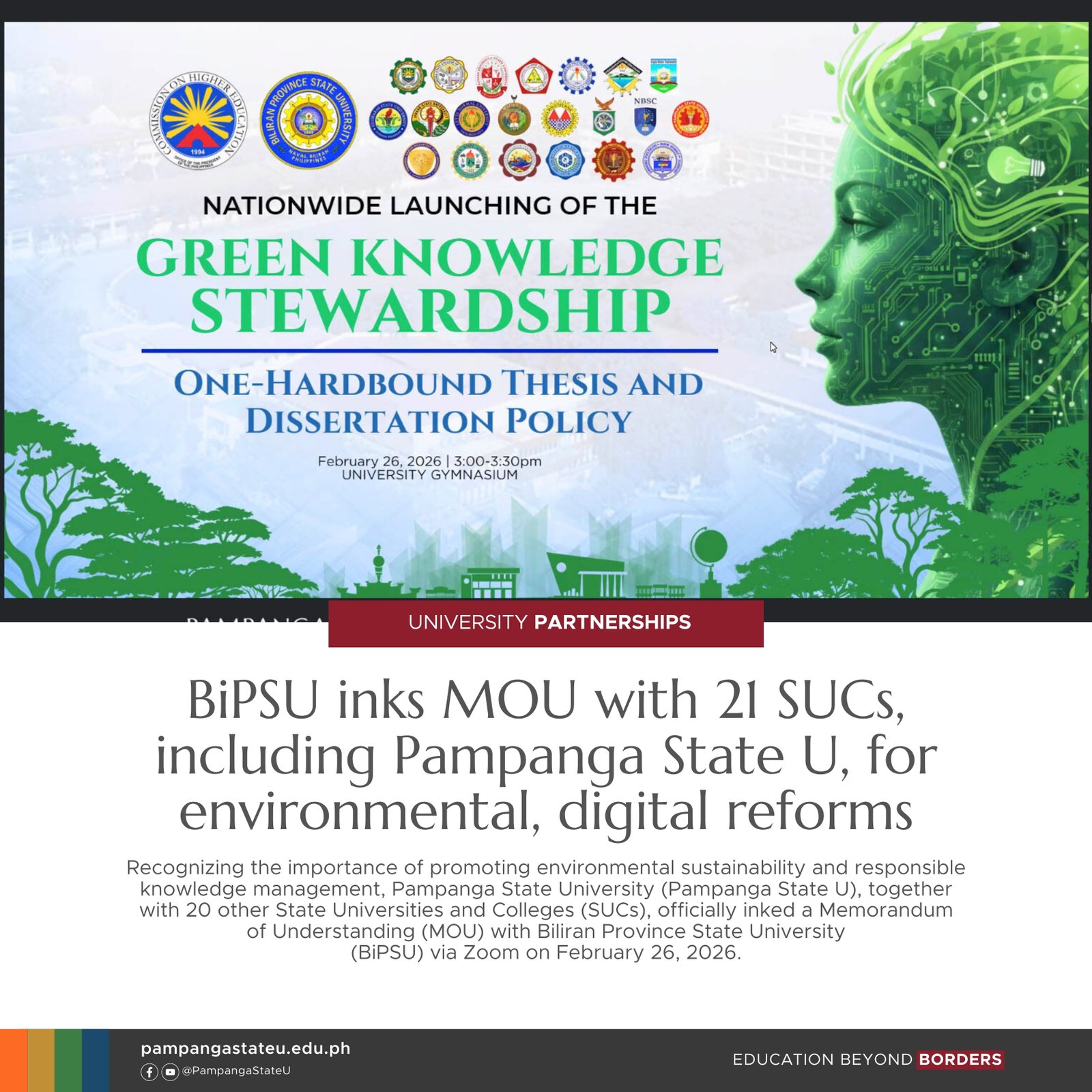Recognizing the importance of promoting environmental sustainability and responsible knowledge management, Pampanga State University (Pampanga State U), together with 20 other State Universities and Colleges (SUCs), officially inked a Memorandum of Understanding (MOU) with Biliran Province State University (BiPSU) via Zoom on February 26, 2026.