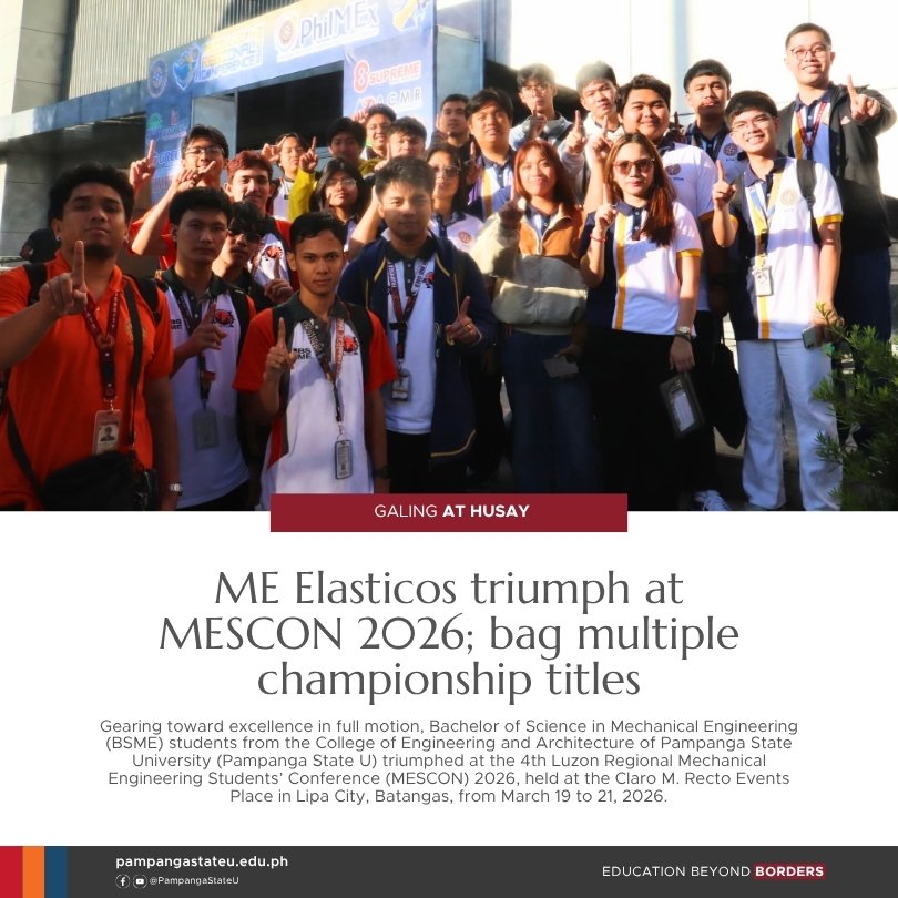 Gearing toward excellence in full motion, Bachelor of Science in Mechanical Engineering (BSME) students from the College of Engineering and Architecture of Pampanga State University (Pampanga State U) triumphed at the 4th Luzon Regional Mechanical Engineering Students’ Conference (MESCON) 2026, held at the Claro M. Recto Events Place in Lipa City, Batangas, from March 19 to 21, 2026.