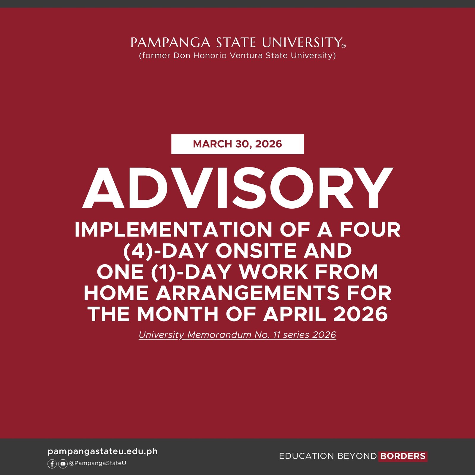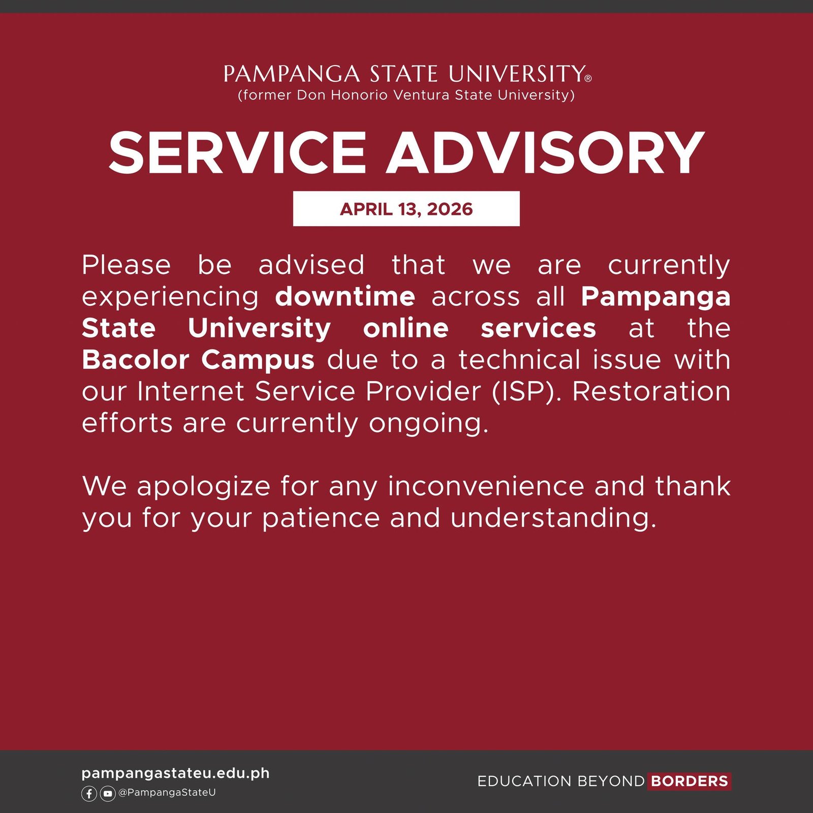 It has come to the attention of hte University that certain individuals or groups are unlawfully using the name of Pampanga State University (PampangaStateU) to solicit monetary contributions or favors from the public.