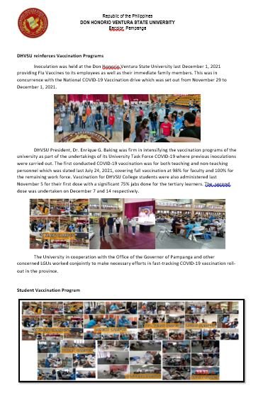 DHVSU President, Dr. Enrique G. Baking was firm in intensifying the vaccination programs of the university as part of the undertakings of its University Task Force COVID-19 where previous inoculations were carried out. The first conducted COVID-19 vaccination was for both teaching and non-teaching personnel which was slated last July 24, 2021, covering full vaccination at 98% for faculty and 100% for the remaining work force. Vaccination for DHVSU College students were also administered last November 5 for their first dose with a significant 75% jabs done for the tertiary learners. The second dose was undertaken on December 7 and 14 respectively.